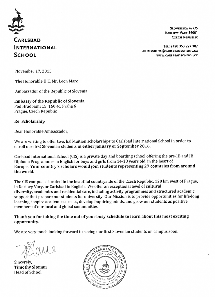 Prejeli smo ponudno za izobraževanje na elitni mednarodni šoli Carlsbad International School v Karlovy Vary, na Češkem.